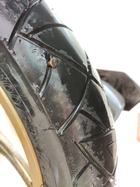 Didn't notice anything much on the way to work, but when moving the bike out of the parking lot to come home (8pm in darkness) the front was very hard to turn, and then noticed problems all the way home. Peeking out from the seat at lights it did seem the front was flat. New MCG2 some months back in place of original IRC that had done near 14,000 miles with still legal tread!
