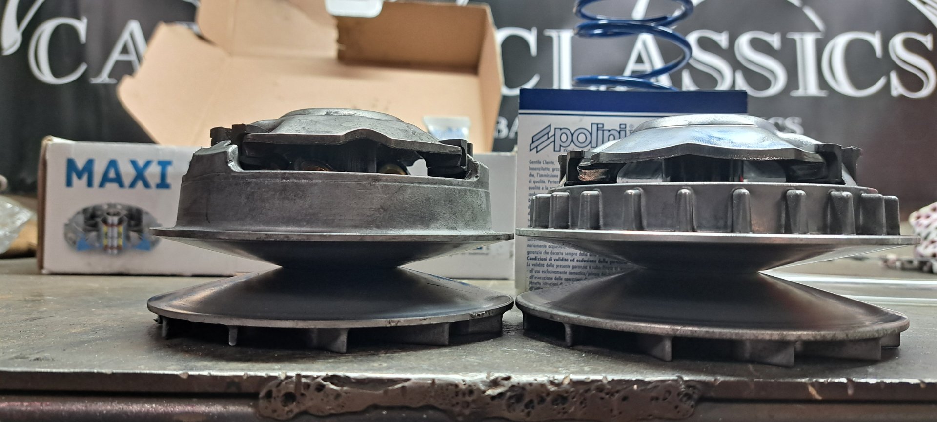 My modified standard variator (on left) is closing tighter than the polini one which is why I'm getting so much more from my modified variator as its pushing belt out further.