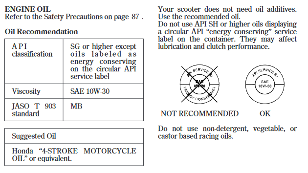 "What oil should I use in my PCX?" 10w30. Synthetic. The only caveat the manual mentions is to make sure it doesn't say "Energy Conserving."