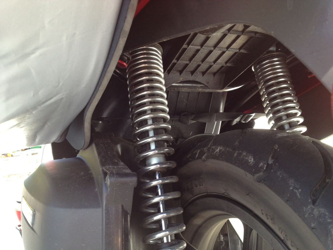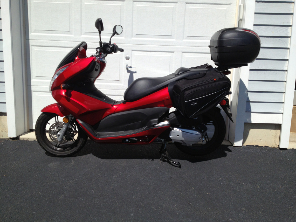 Although I haven't actually ridden with the side bags yet, one issue I've found already is that they make putting the scoot on the center stand much more difficult, as they block where I normally grab onto the body to rock it backwards. Not impossible, but not graceful either. The wide velcro tabs go under the seat (which never seems to close properly anyway), and the smaller clips go above the tail light and above the wheel to keep the bags on the frame. They are wide, and hang down at a bit of an angle even when empty, but they come with a good thick heat shield that looks like it will also keep the side panels from getting scratched. The bag straighteners have a really good fit, too. Once I make a real grocery run, I'll be sure to update the post. Meanwhile, I did take them off ahead of my next ride, as there's really no need for them unless I'm actually carrying stuff.