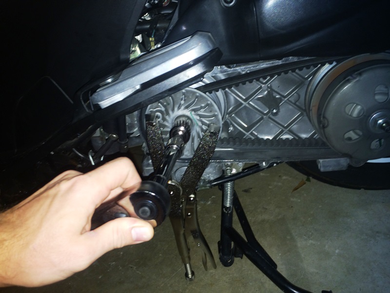 I bought a variator removal tool from Amazon. You ALWAYS should have the right tools to do the job. ;) I also used a 1/2" ratchet set, a 1/4" ratchet set, and a philips head screwdriver.