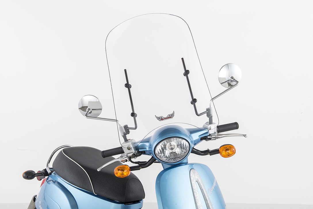 Oops -- I meant Slipstreamer, not Windjammer. Their new scooter windshields are generic, not meant for any particular bike. Here's a picture of the mirror- mount.